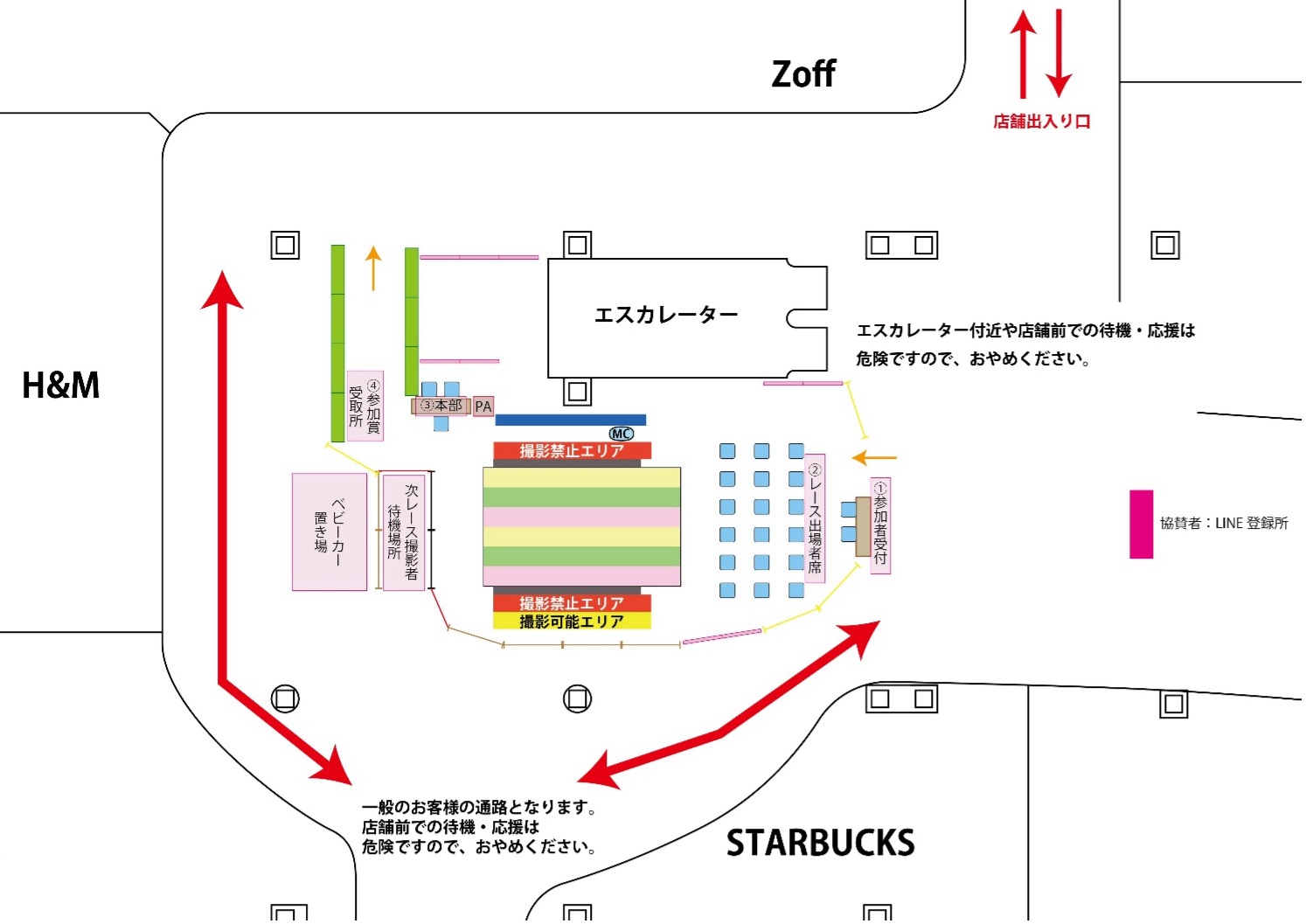 • 進行状況によってレース開始時間が前後する場合がございます。レース出場者席に着席後は、そのまま座席でお待ちくださいますようご協力お願いいたします。